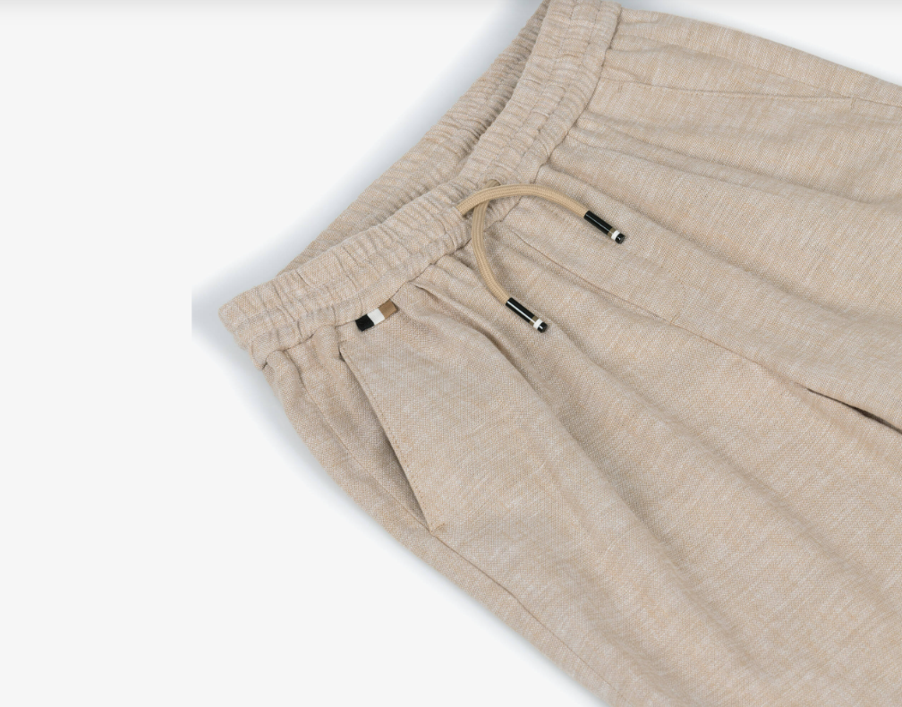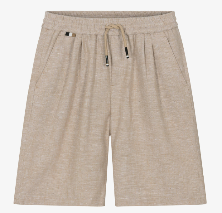 Beige shorts for boys by BOSS, made in a soft linen and viscose blend. Comfortable and stylish, they have an elasticated waistband with a drawstring tie for an adjustable fit. There are useful front and back pockets and signature tricolour detail for a subtle designer finish.