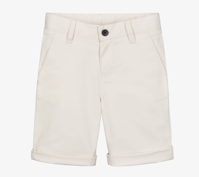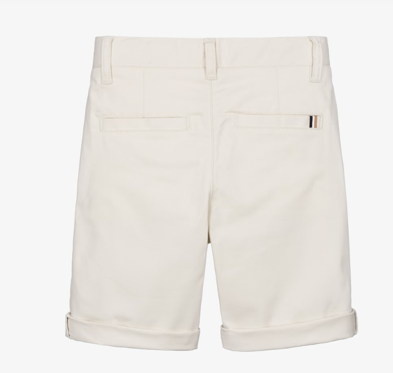 Light beige chino shorts by BOSS for boys, with a smart-casual look. Made in soft cotton twill, they have slanted front pockets, and a tricolour logo tab on one of the back pockets. Bermuda length, they fasten with a zip and branded button. A signature tricolour trim on the inside of the adjustable waistband adds a distinctive finishing touch.