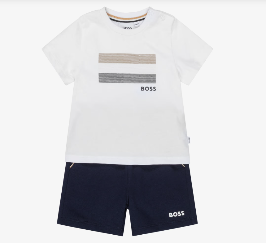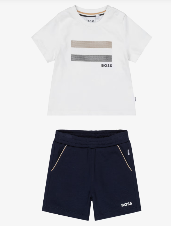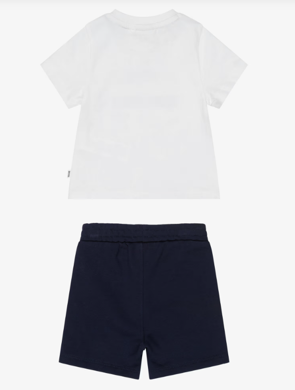 Mini-me white and navy blue jersey shorts set for little boys by BOSS, made in soft cotton jersey. Casual and comfortable, the T-shirt has a signature striped logo design and poppers on one shoulder for speedy dressing. The comfortable shorts has a white logo printed on one leg, slanted pockets and a gently elasticated waist for easy wear.