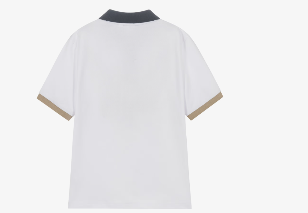 This white Mini-me polo shirt for boys by BOSS is a stylish addition to any wardrobe. Made in soft, comfortable cotton piqué, it has a ribbed collar in contrasting navy blue and beige trims on the cuffs. The brand's rubberised, signature logo is on the chest for a distinctive finish and the brand's tricolour logo trim can be seen on the inside of the neckline.
