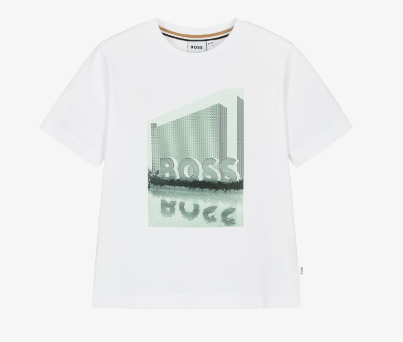 BOSS Boys White Cotton T-Shirt with Green Logo Print