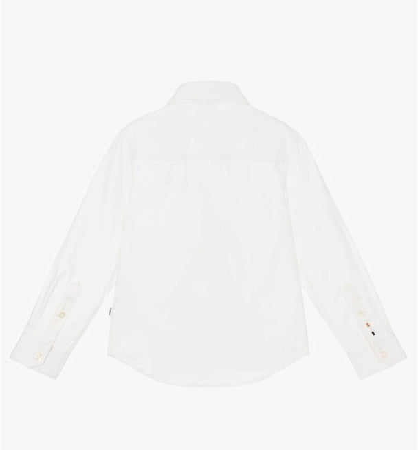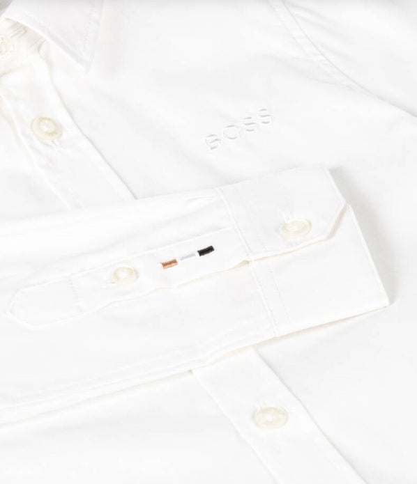 Smart, white Mini-me Oxford cotton shirt for boys by BOSS, with a tonal logo embroidered on the chest. Soft and lightweight, it is classically styled with long sleeves, a pointed collar and a curved hem. It fastens with buttons on the front and cuffs.