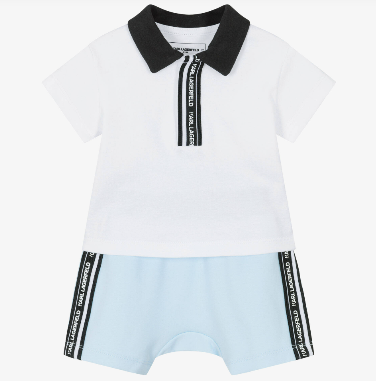 White and pale blue shorts set by KARL LAGERFELD KIDS, combining casual style with comfort for little boys. Made in soft cotton jersey, the polo shirt has a large pale blue Karl Ikonik logo on the back and branded trim on the front. The shorts have an elasticated waistband and matching branded trims for a coordinated look.