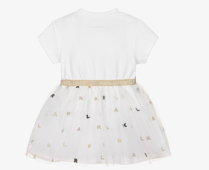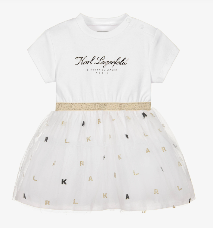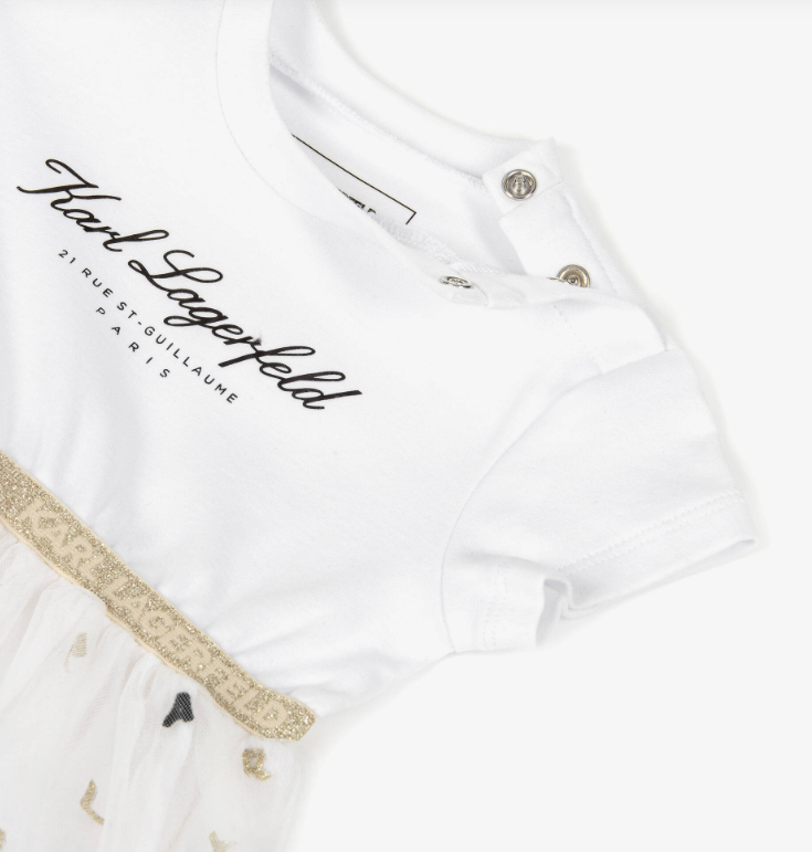 This lovely white dress by KARL LAGERFELD KIDS combines style and comfort for baby girls. The soft cotton jersey top features a bold Rue St Guillaume logo print on the front and poppers on one shoulder for easy dressing. A glittery gold elasticated waistband, with signature branding, adds a touch of sparkle, whilst the full, gathered and lined tulle skirt is adorned with shimmering logo letters for an eye-catching finish.