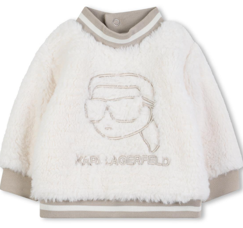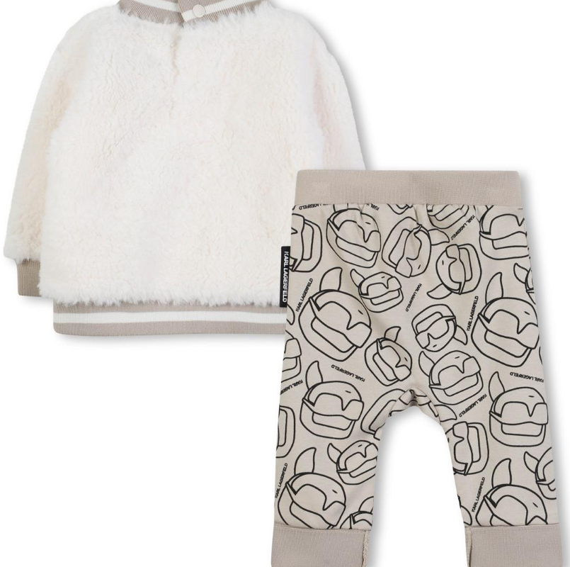 Set of sweatshirt and jogging pant. Sweatshirt in 100% PA faux shearling, snaps closure on the back and branded KARL LAGERFELD illustration with head of KARL on the front. Coton jogging pant with head of KARL all over print. Branded woven label on side. Sold in a gift box.