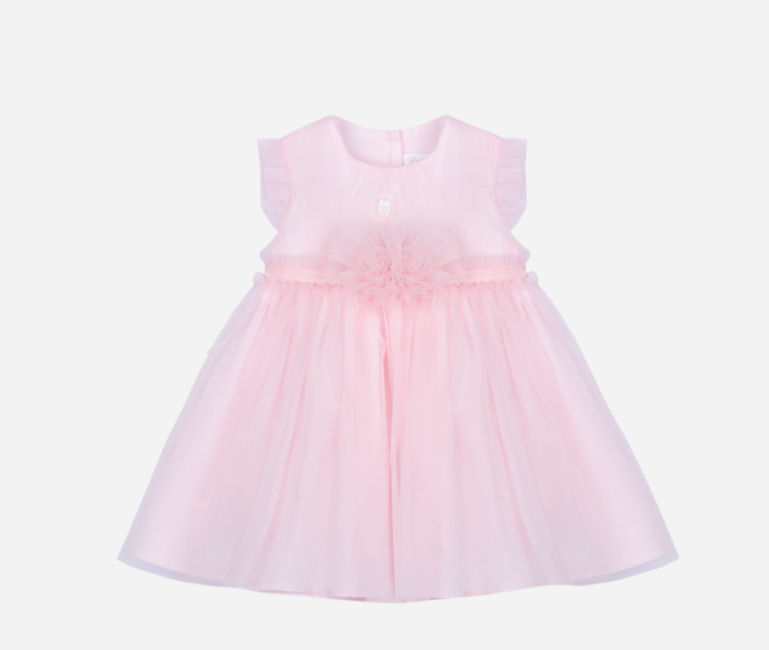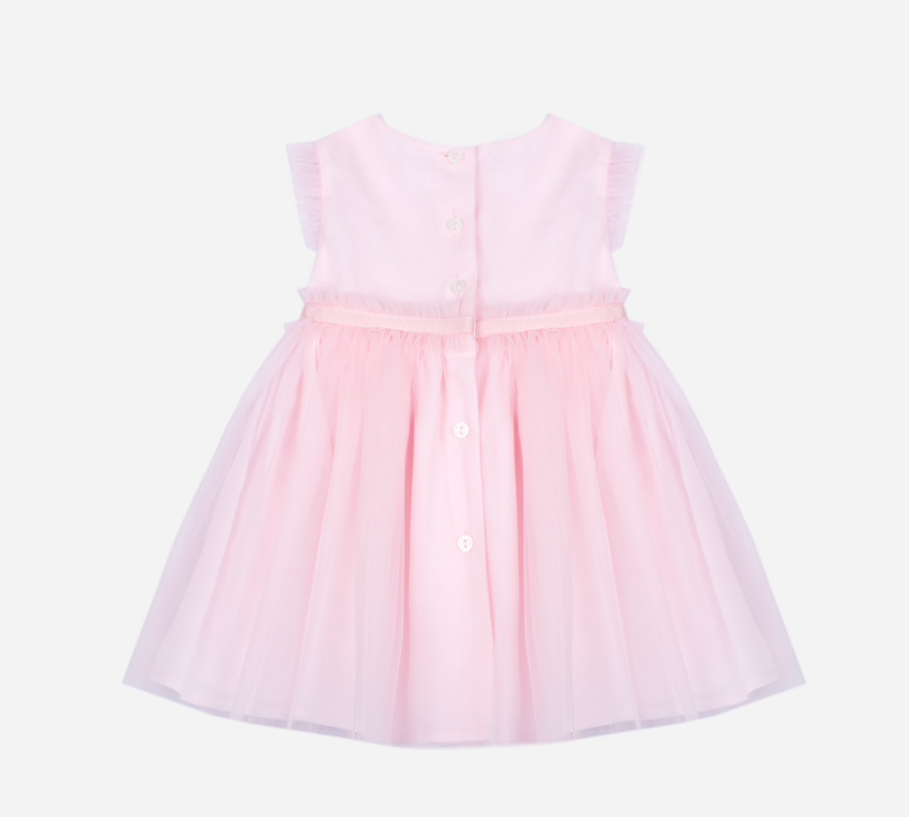 This elegant pale pink dress is perfect for special occasions. Made from 100% cotton, it features a delicate tulle detail at the waist adding a charming touch. The short sleeves with ruffles complete the sophisticated and delicate look for girls.