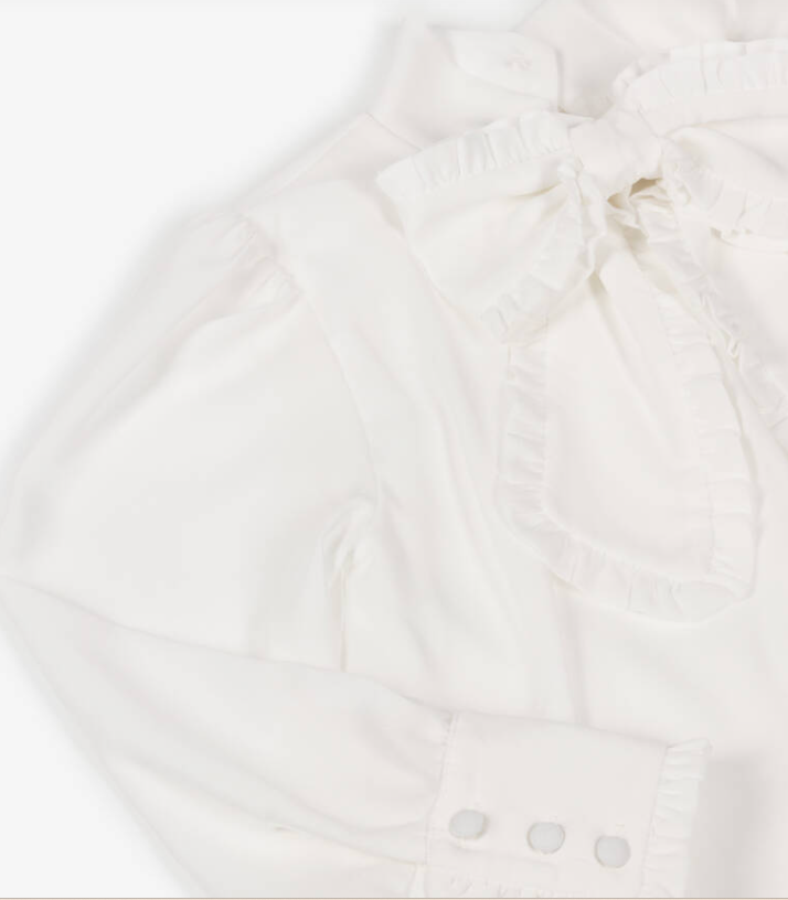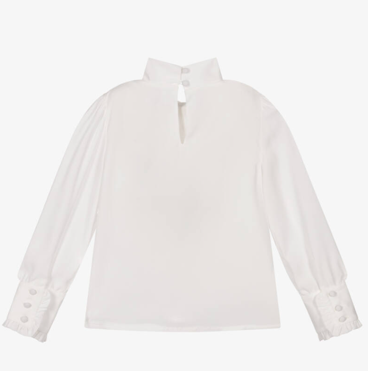 This elegant ivory crêpe blouse for girls by Patachou is ideal for a special occasion. Lined in lightweight cotton for comfort, it has a stand-up collar with a statement, ruffle-trimmed bow, and puffed sleeves with long, buttoned cuffs. A keyhole opening at the back fastens with buttons for a smart finish.