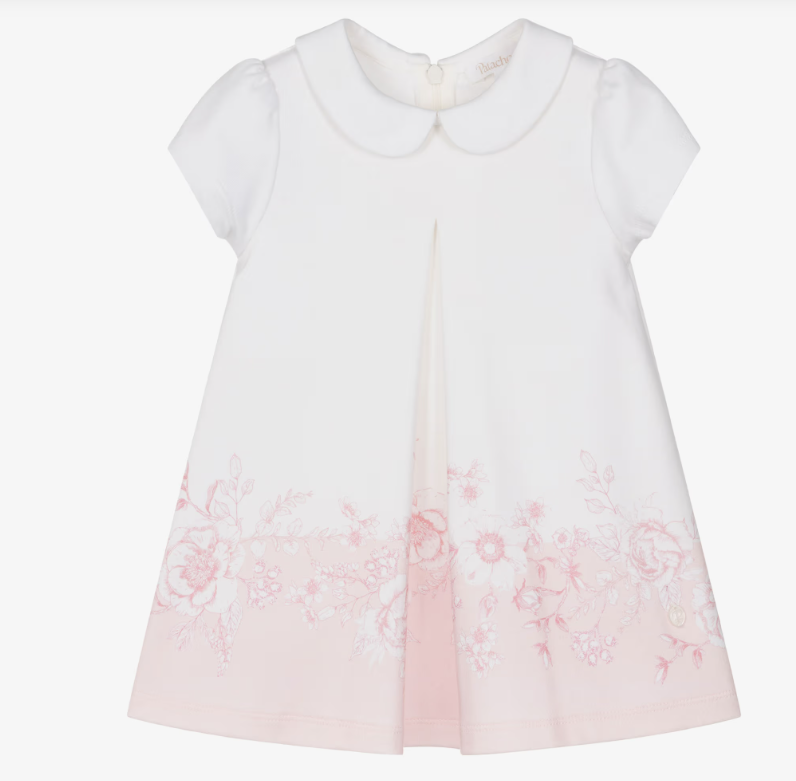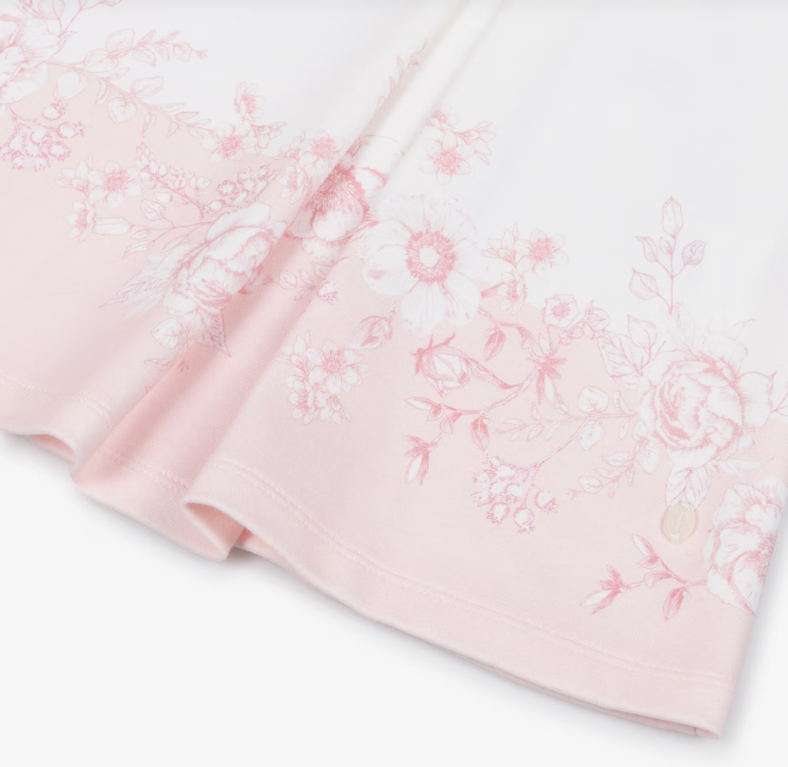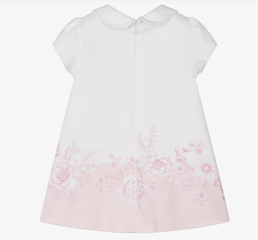 Lovely pink and ivory dress for girls by Patachou, with a pretty floral print around the hem. Made in soft cotton jersey, it has a smart Peter Pan collar and a pretty inverted pleat on the front to create a gentle flair. Comfortable yet stylish, the dress fastens with a concealed zip on the back.
