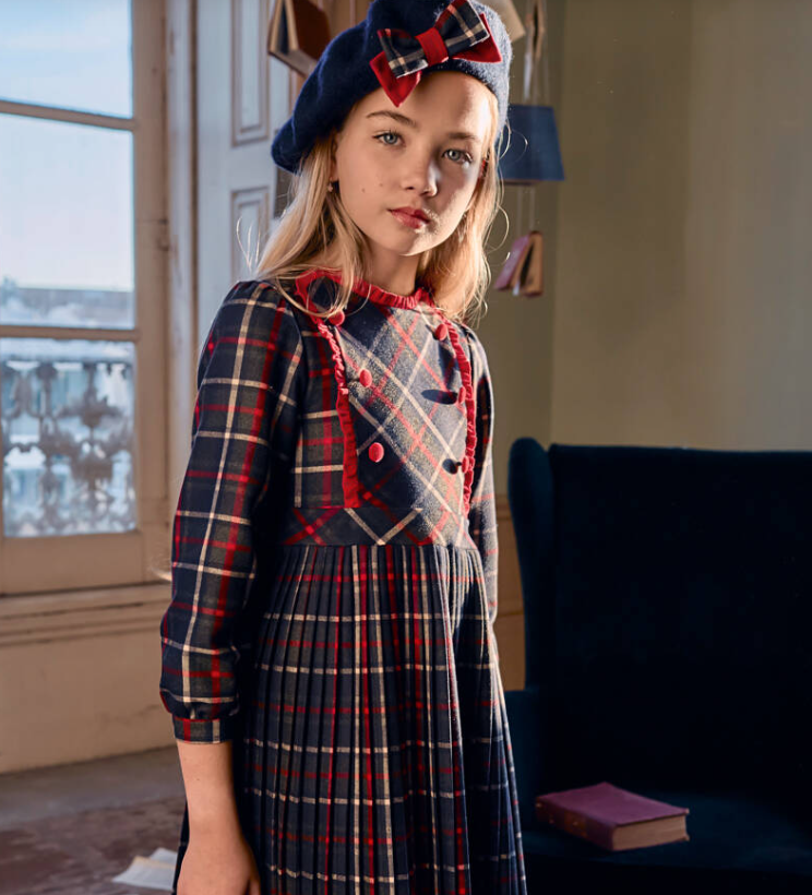 Smart navy blue, grey and red tartan dress for girls by Patachou, made in soft, brushed viscose-blend twill. It has a bib-style bodice, with decorative red velvet buttons and matching ruffle trims. With a concealed back zip for a neat finish, the dress has buttoned cuffs, a pleated skirt and is comfortably lined in cotton voile.