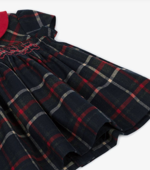 Smart yet comfortable for girls, this navy blue Patachou dress is made in soft and stretchy cotton jersey. The charming design features decorative gold crest buttons on the front, with red and blue pleated grosgrain trim on the collar and matching bows on the waistline. This elegant style is complete with a pleated skirt and a concealed zip fastening on the back.