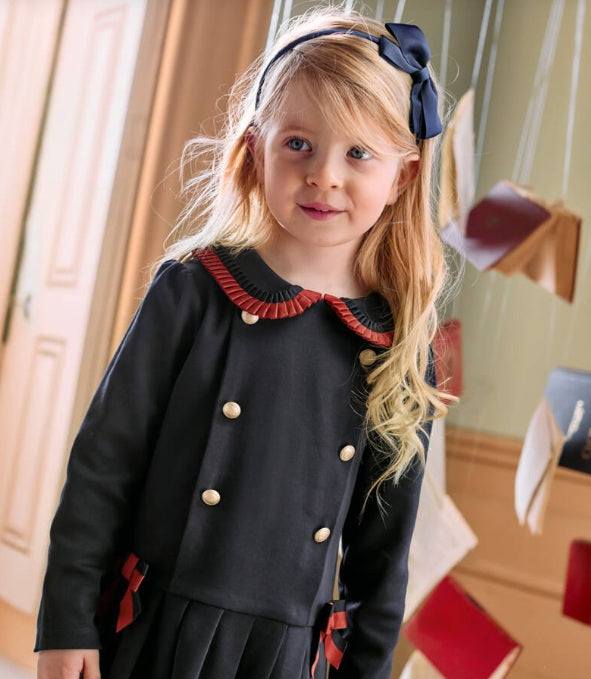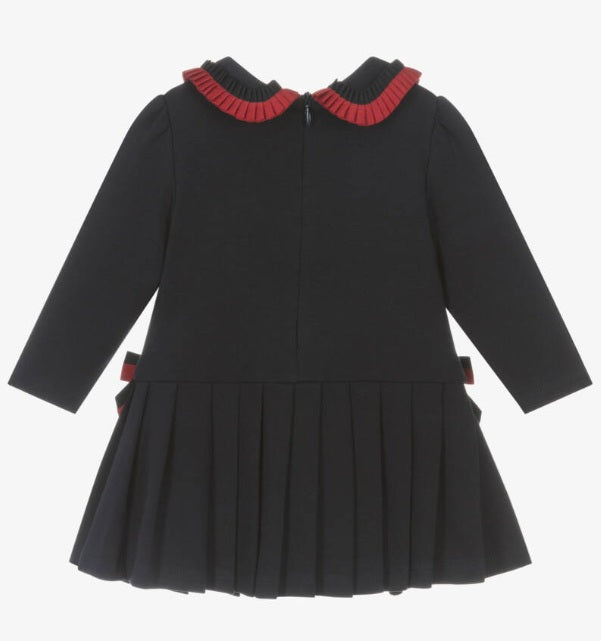Smart yet comfortable for girls, this navy blue Patachou dress is made in soft and stretchy cotton jersey. The charming design features decorative gold crest buttons on the front, with red and blue pleated grosgrain trim on the collar and matching bows on the waistline. This elegant style is complete with a pleated skirt and a concealed zip fastening on the back.