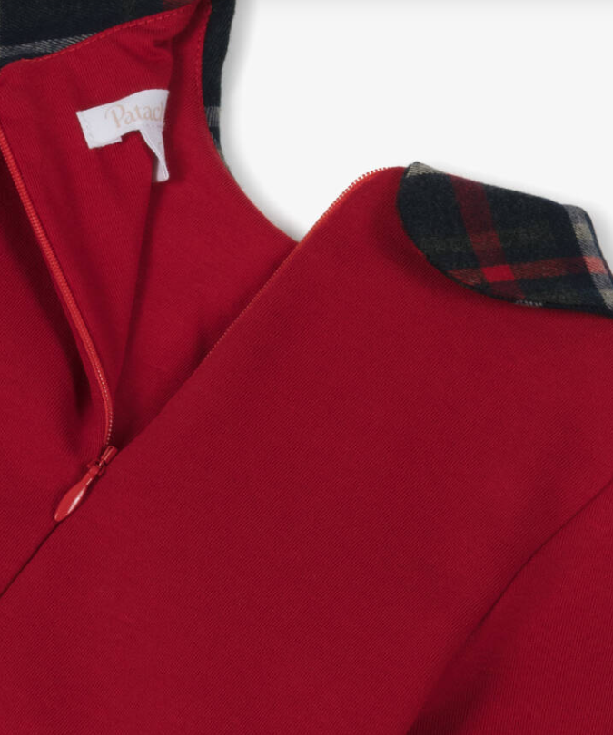 This red dress for girls by Patachou features a charming navy blue tartan pattern and playful pleats. The long-sleeved top is made in soft cotton jersey for comfort, with a cute embroidered dog on the front and a contrasting tartan collar. The pleated tartan skirt is made in beautifully soft brushed twill and the dress fastens neatly on the back with a concealed zip.