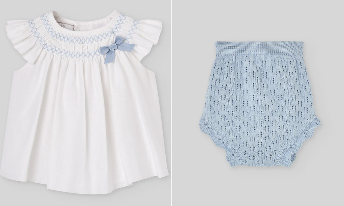 Girls' outfit, consisting of a short dress in lightweight fabric with delicate embroidery and matching bloomers. Perfect for ceremonies or summer events, combining elegance and comfort.