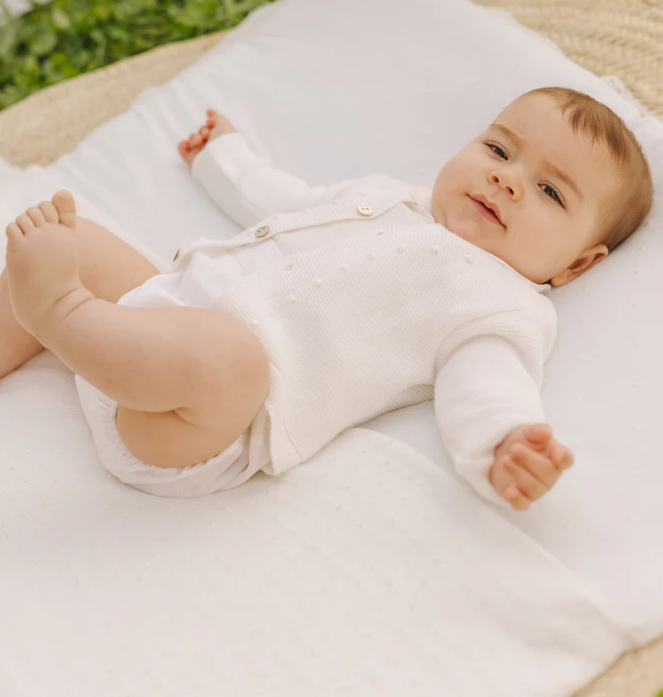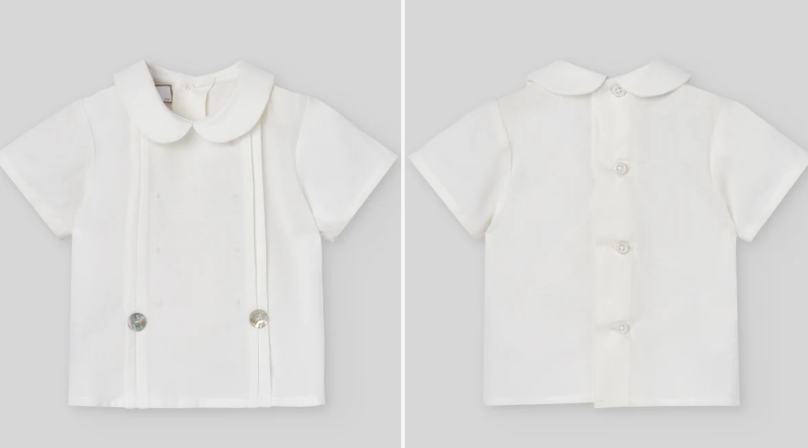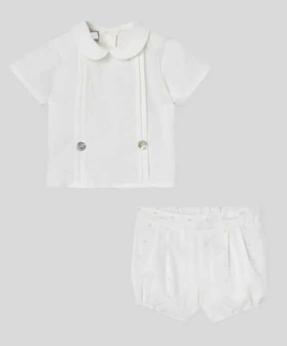 This ivory shorts set by PAZ Rodríguez is a charming outfit for baby boys. Made in soft cotton, the top has a sweet Peter Pan collar, delicate pintucks and button fastenings on the back. The matching shorts have embroidered detailing, gently elasticated trims and an adjustable waistband for an ideal fit. The two pieces fasten neatly together for a traditional, tucked-in look.