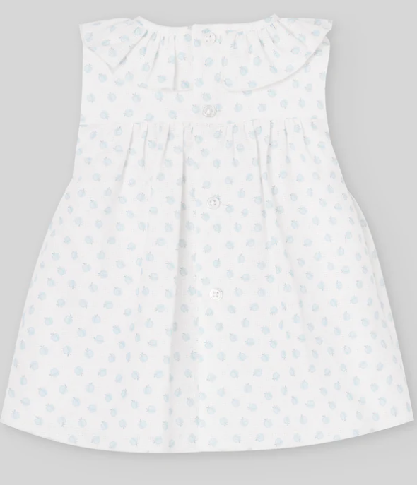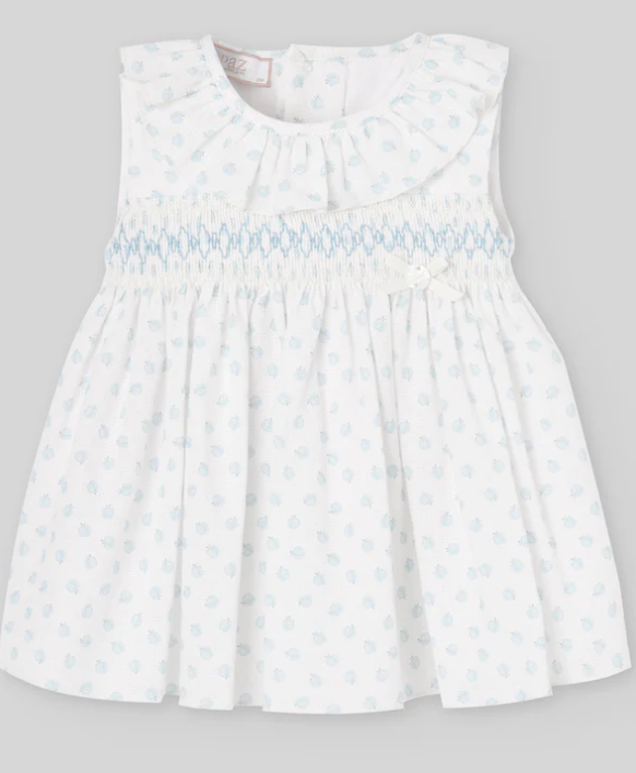 Dress for baby girl with handcrafted smocked bodice and frilled neckline. Its lightweight fabric and careful construction make it an essential piece for the summer season.