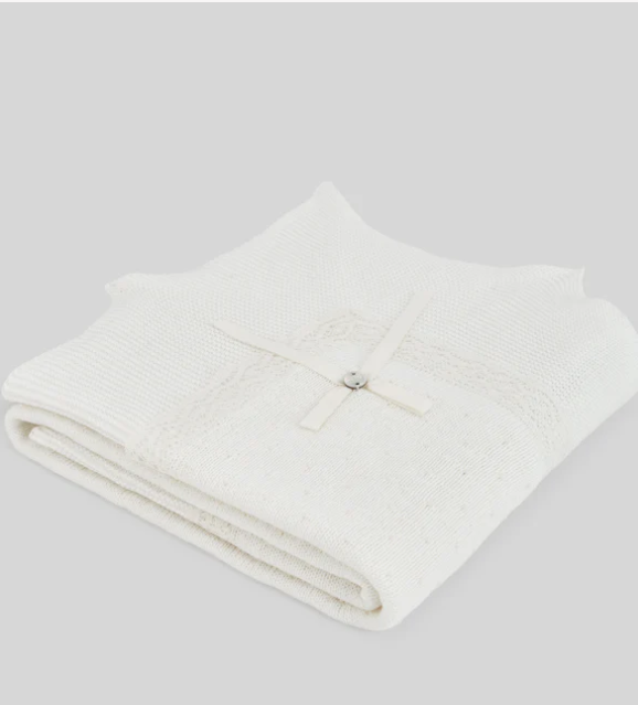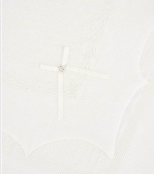 A knitted baby shawl with an openwork design and a very soft feel. Its powdery tone and handcrafted finish lend a classic and elegant touch. Ideal for keeping your baby warm and stylish on any special occasion.