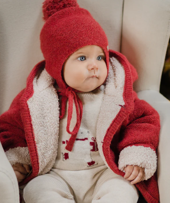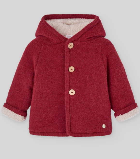 Knitted coat with hood, cross-buttoned front, classic design, lined in cotton and adorned with a mother-of-pearl tag.